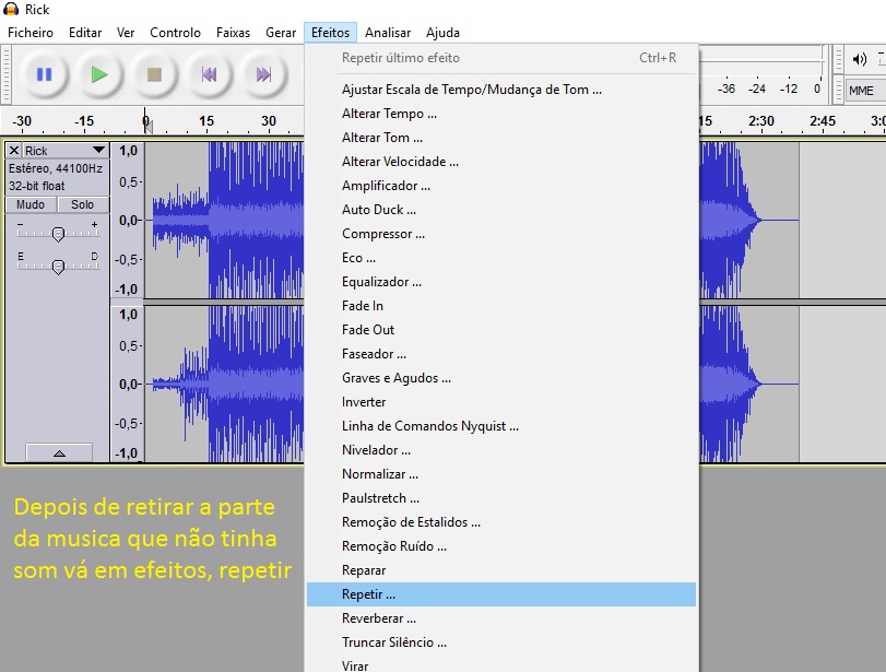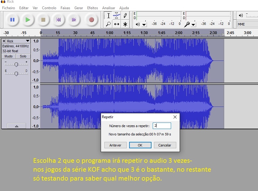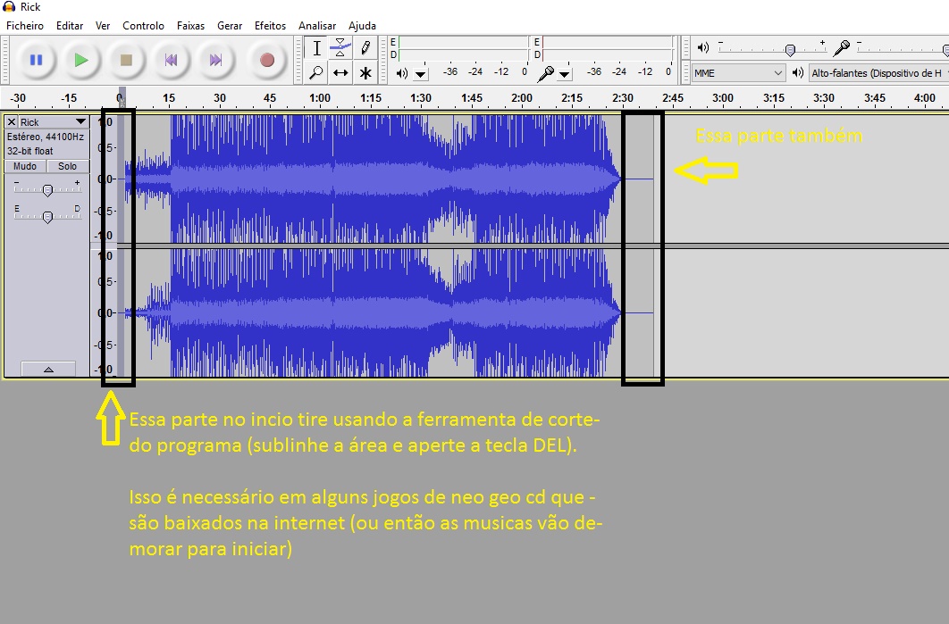 2) OTIMIZANDO MÚSICAS DO JOGO: Sobre o “Neo Geo CD”, percebi que as musicas em “variable bit rate” funcionam melhor, também percebi que as musicas após acabarem não voltam mais, resolvi o problema fazendo “loop” nos arquivos de áudio “mp3” com o programa “audacity” (vocês podem encontrar diversos tutoriais no youtube) Grato Alan Oliveira (Rato Puto) por esta dica e pelo pequeno mas esplendido tutorial a seguir: