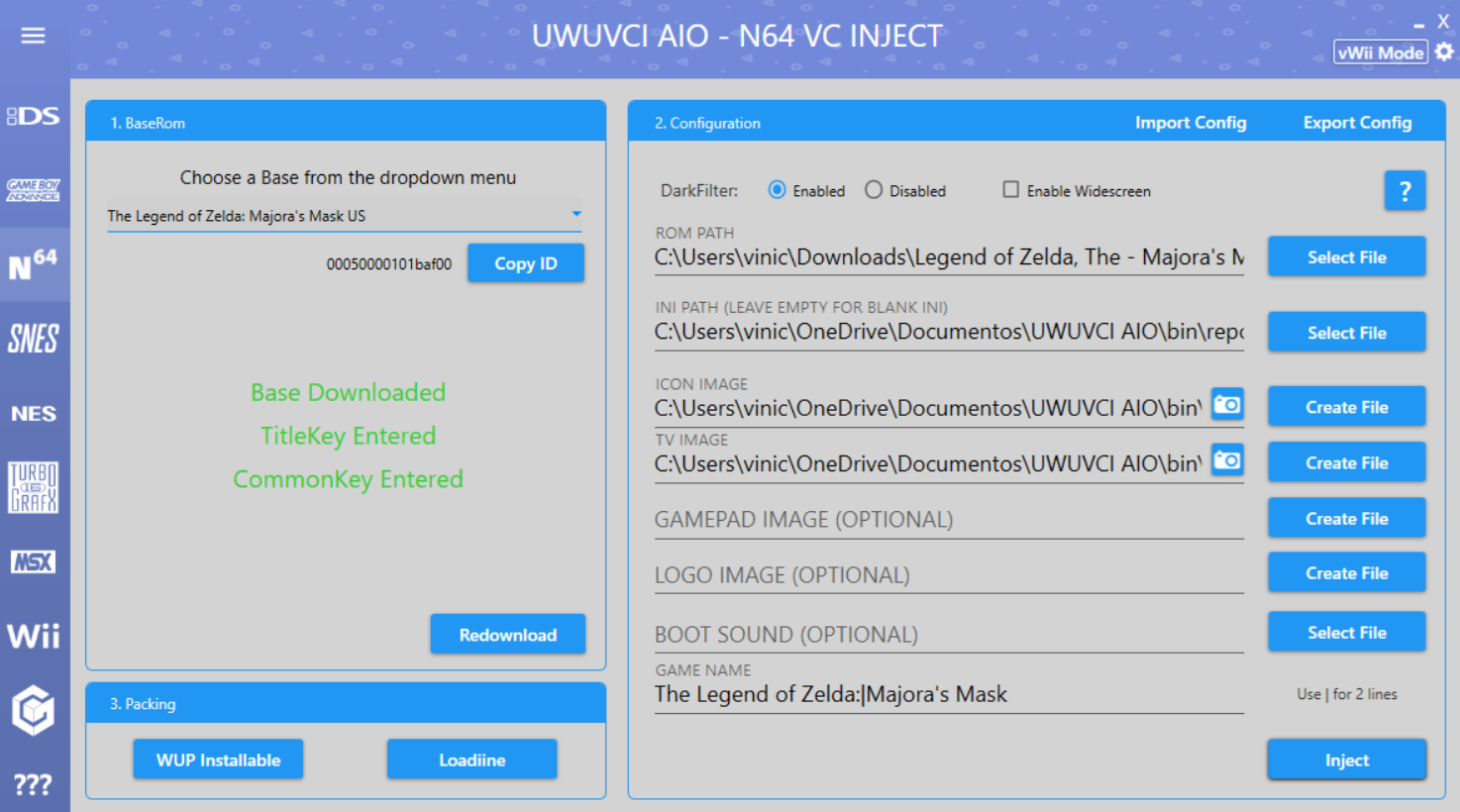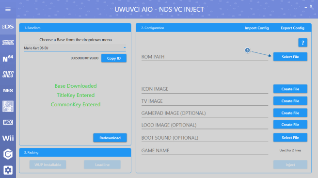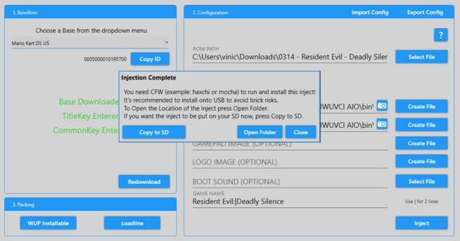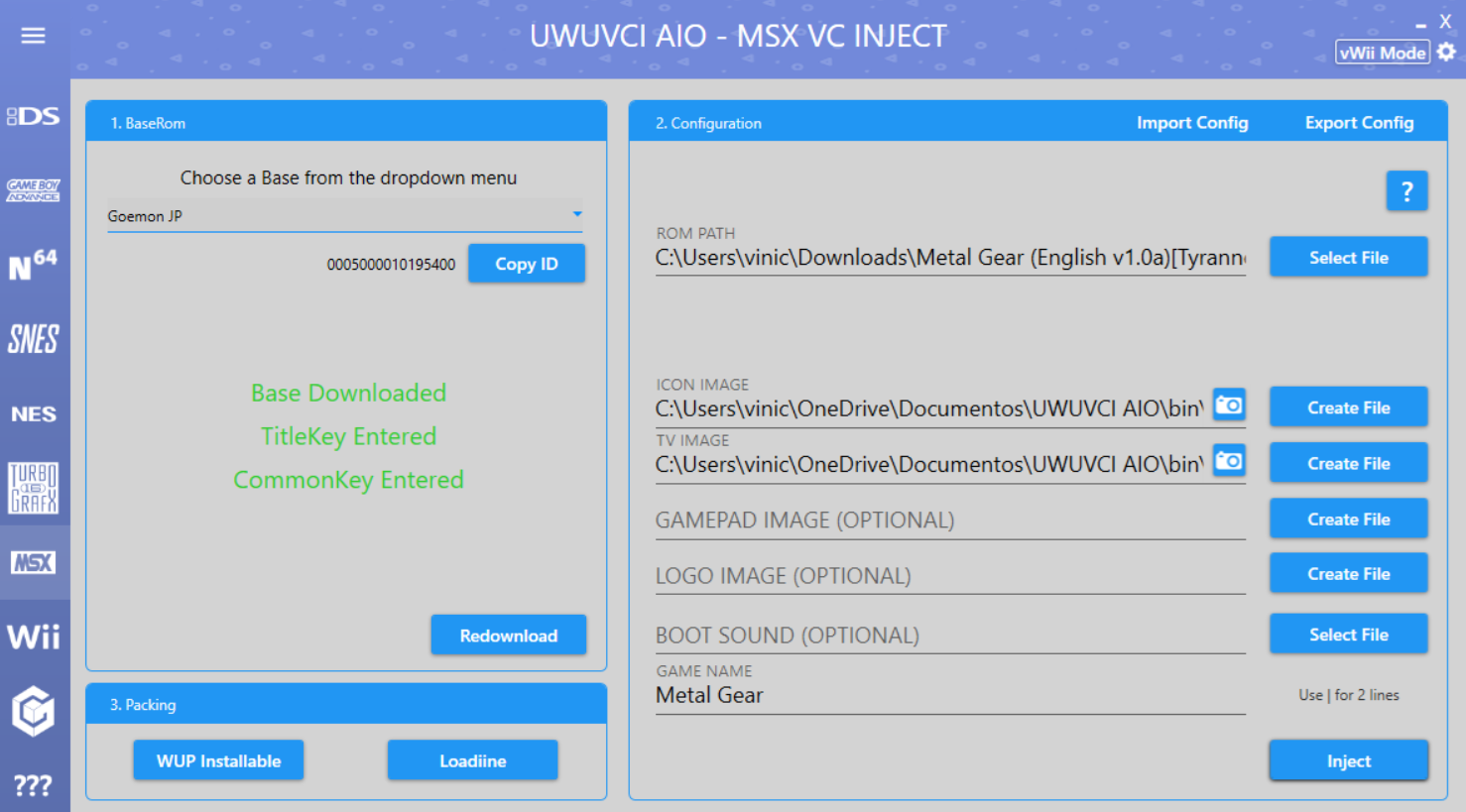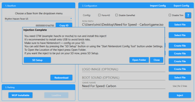Com isso, basta repetir os ultimos passos da seção do Nintendo DS: Configurar o nome do jogo, injetar e selecionar o formato WUP e passar o arquivo pro cartão SD.
