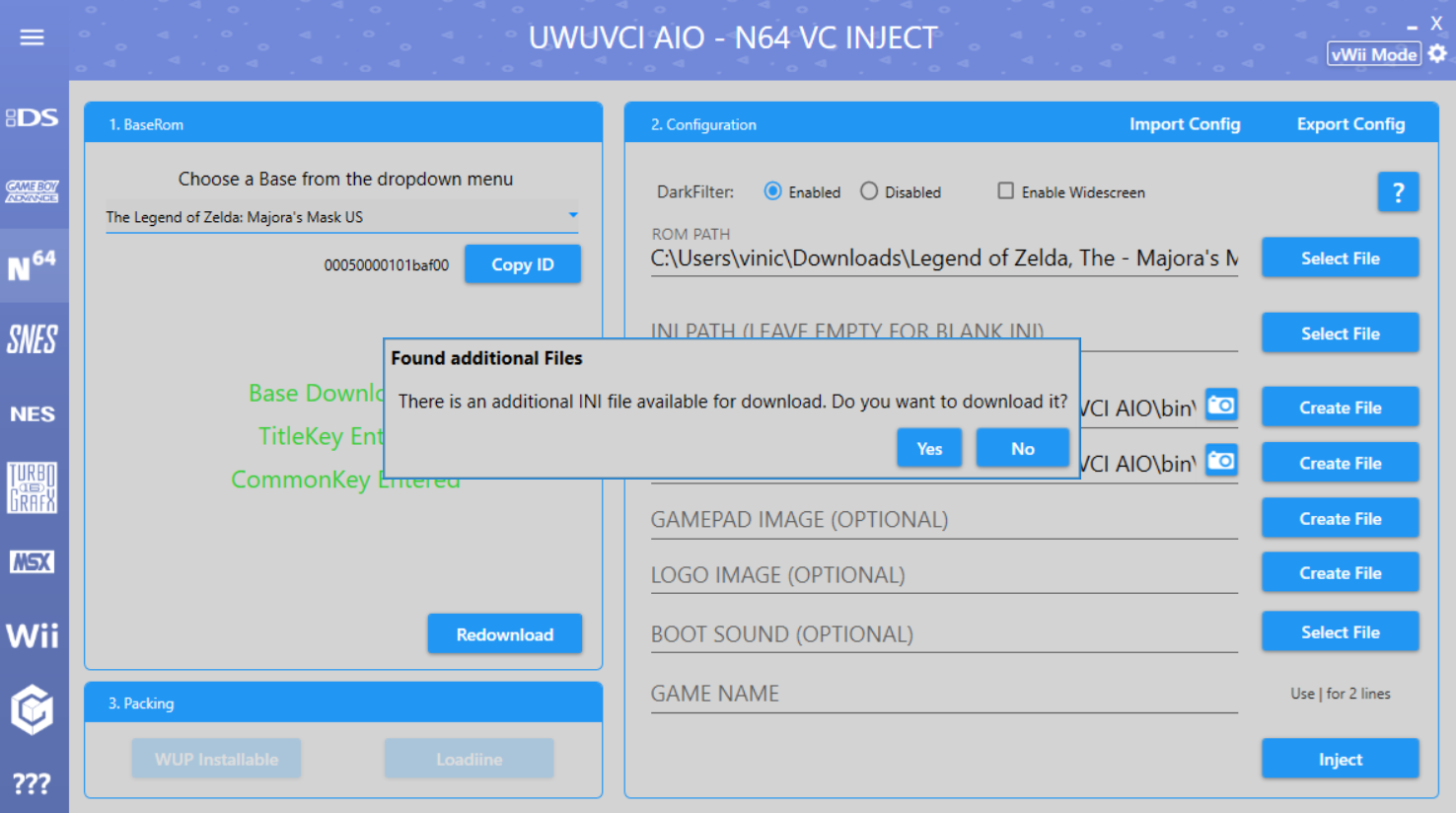 Ao selecionar a rom, que também possui imagens no BD, agora também pro N64 existem as INIS, que são configurações personalizadas pros jogos. Sempre que houver uma predefinida no BD do programa, confirme com YES para baixá-las: