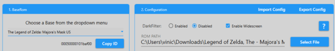 No emulador de N64, estarei testando uma versão de Majoras Mask Redux que achei na net, que possui melhorias em cima da versão original do jogo. Para isso, usarei como base a mesma versão do jogo original do Virtual Console, inserindo a Title Key e etc: