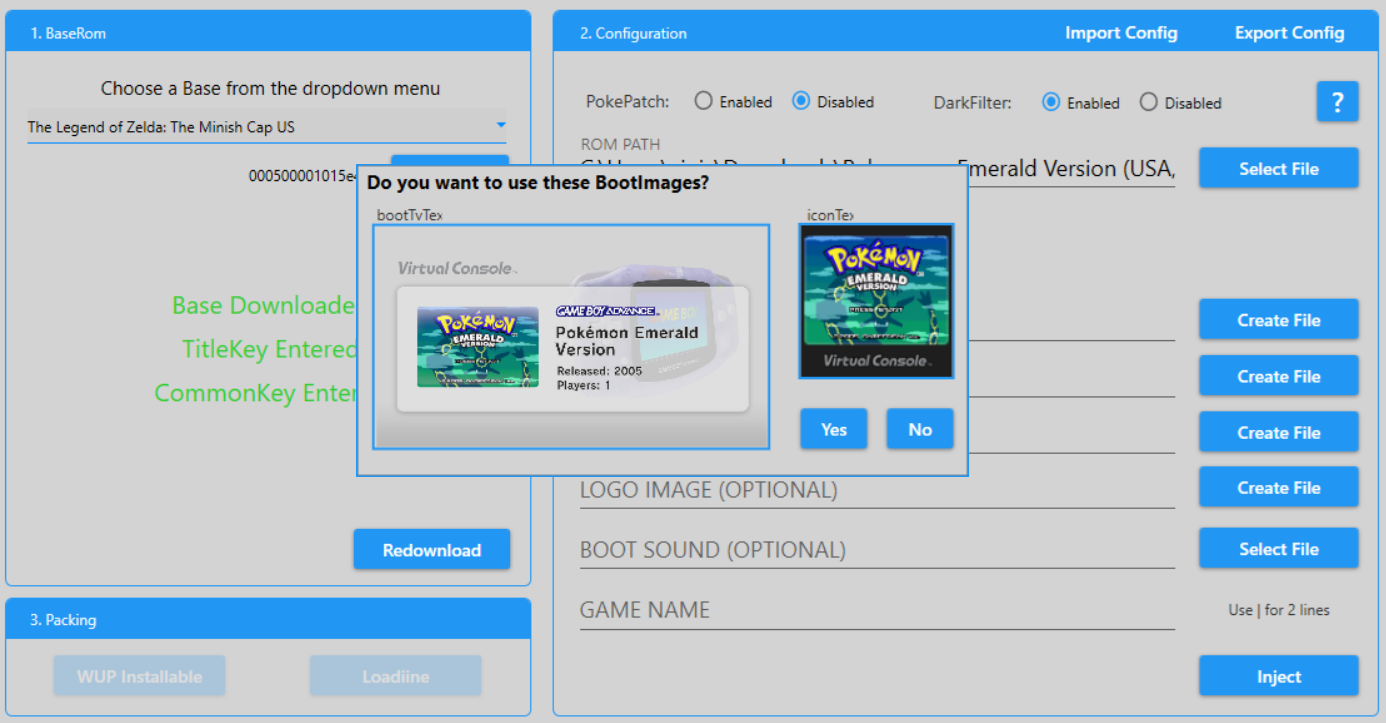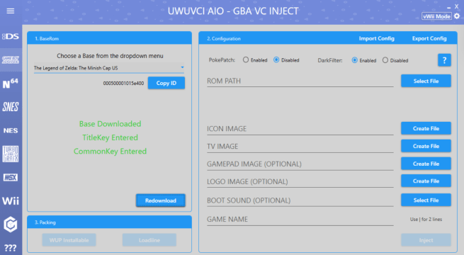 O injetor nesta parte, além do GBA, possui compatibilidade com Game Boy e Game Boy Color. Estarei usando para teste nesta seção o Pokémon Emerald e GBA, que tem como indicado o jogo The Legenda of Zelda: Minish Cap (USA). Repita o passo da seção de NDS colocando a Title Key do jogo base. A Wii U Common Key só precisa ser inserida uma vez:
