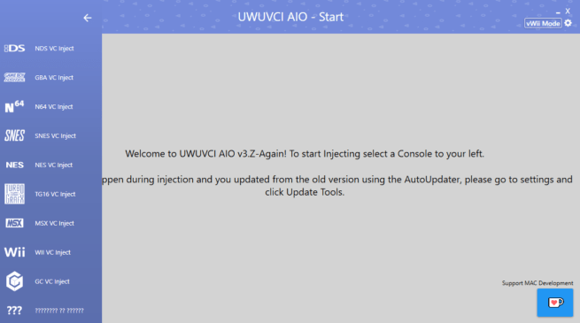 O Wii U possui uma biblioteca retro poderosa, seja por desbloqueio e mesmo oficialmente. Com o serviço do Virtual Console, você podia ter jogos de Nintendo DS, GBA, Nintendo 64, Super Nintendo, Nintendo, Turbografx-16, MSX e Wii, totalizando mais ou menos 318 jogos no serviço. O UWUVCI é uma ferramenta que ter permite injetar jogos por cima de outros oficiais lançados, com a adição de jogos de GameCube rodando nativamente no seu console, além de diversas melhorias, como remover filtros escuros, formato tela cheia, pixel perfect e outros.