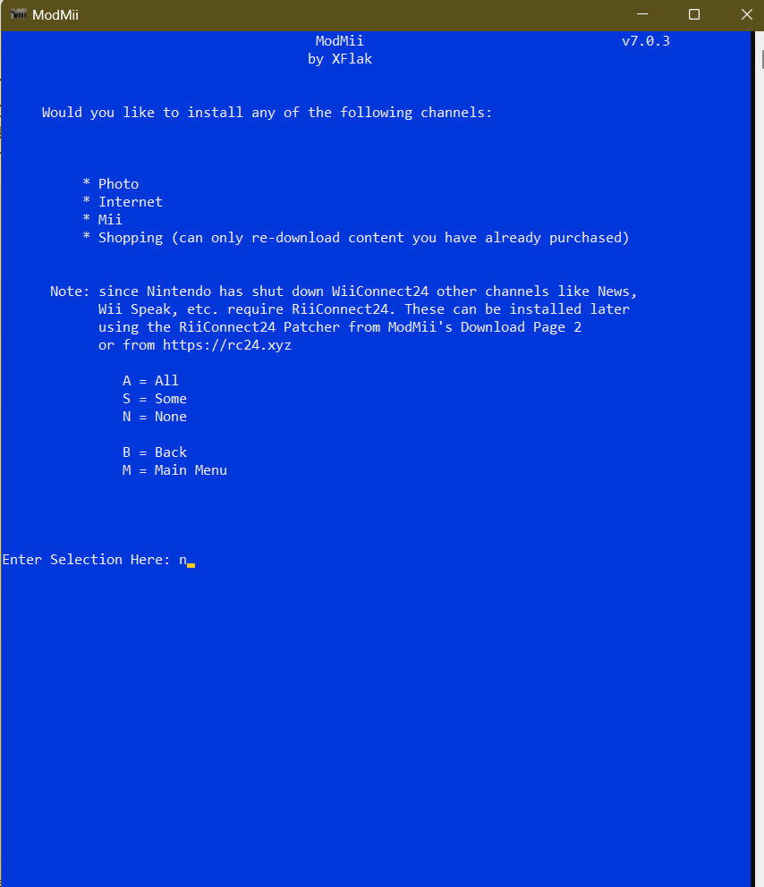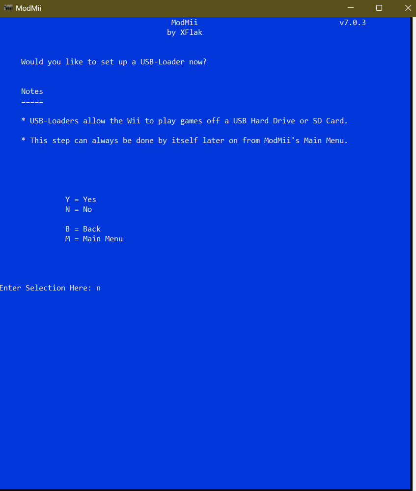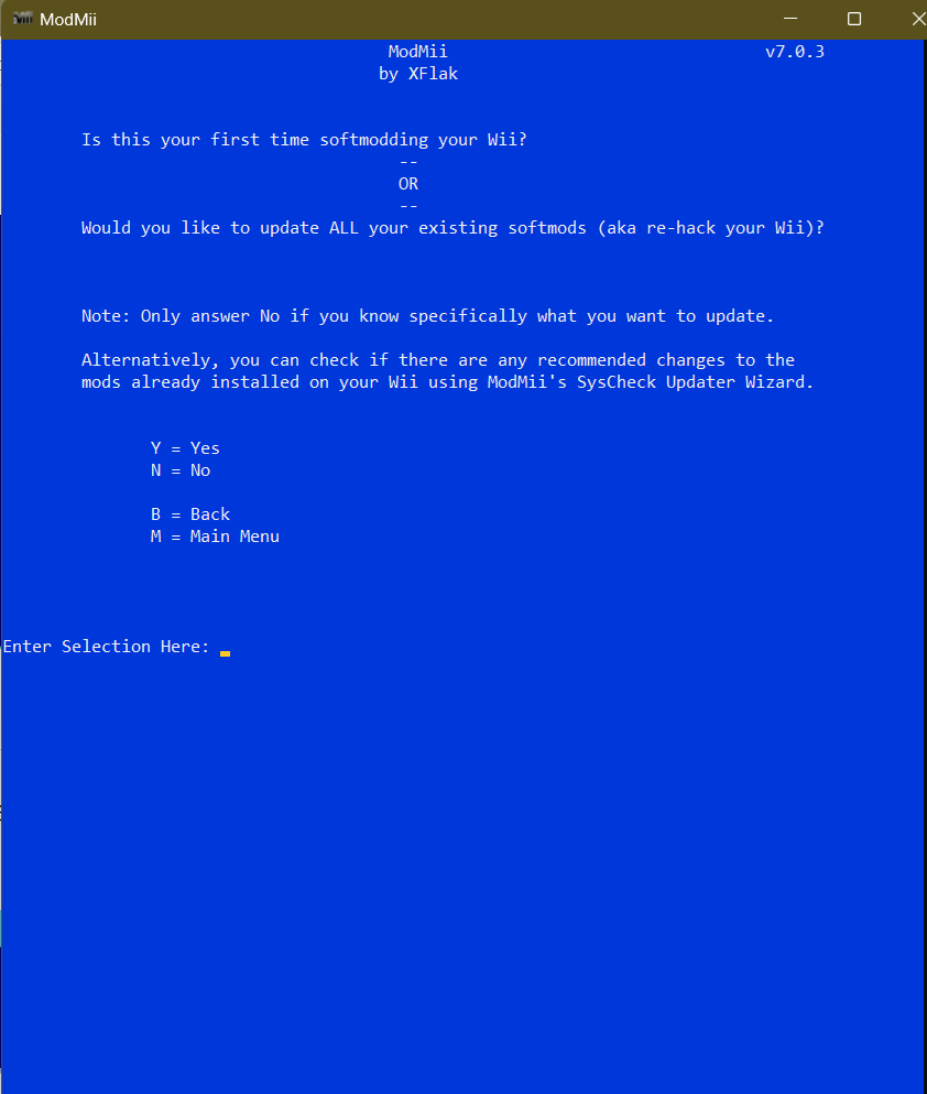 O programa está perguntando se é sua primeira vez hackeando o Wii ou se você deseja atualizar todo seu desbloqueio. Digite “n” e confirme com enter;