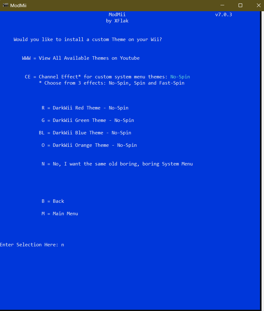 Por questões de simplicidade do tutorial, digite “n” para não instalar nenhum tem customizado no Wii Menu (em breve, tutorial atualizado aqui no site). Confirme com enter: