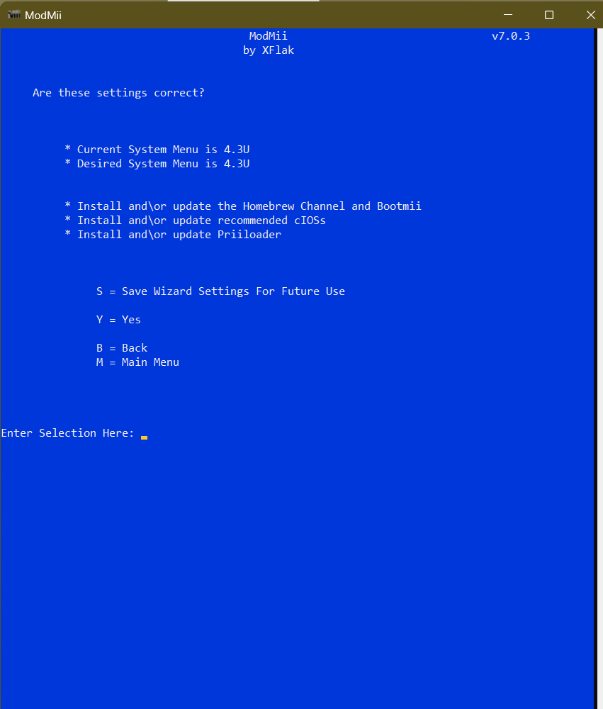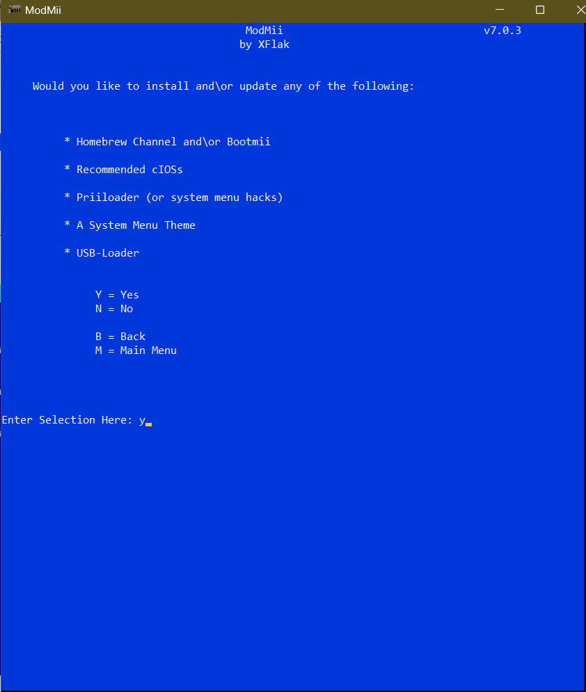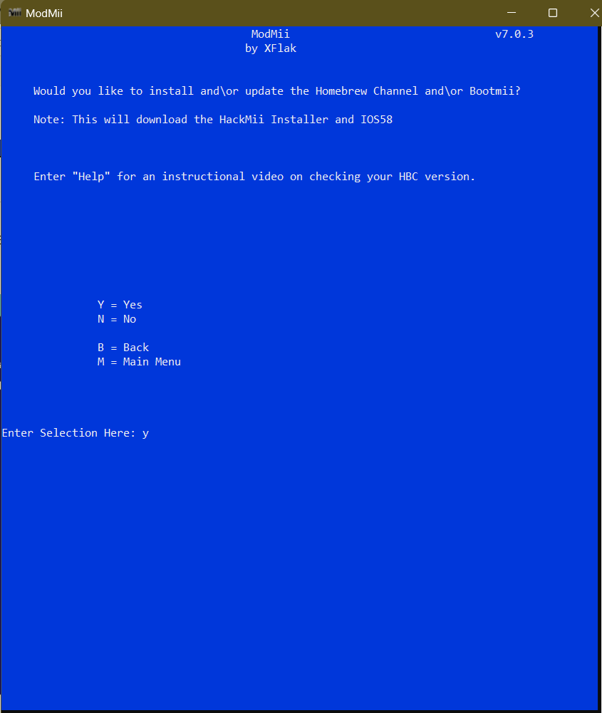 Digite “y” para instalar e/ou atualizar o The Homebrew Channel e o Bootmii. Confirme com enter: