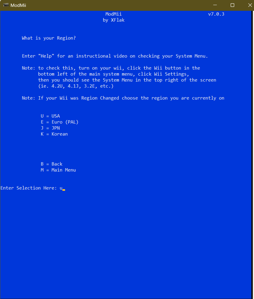 Selecione a região do seu console, seja “U” se for americano, “E” se for europeu e etc. Após escolher, confirme com enter: