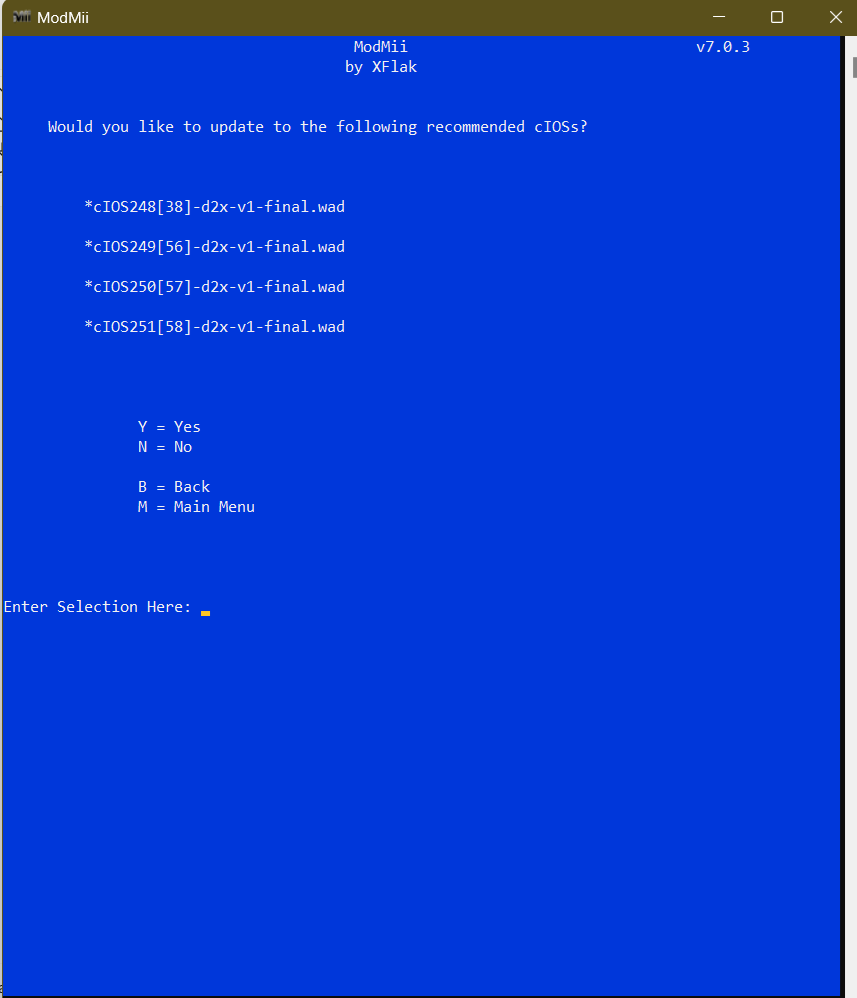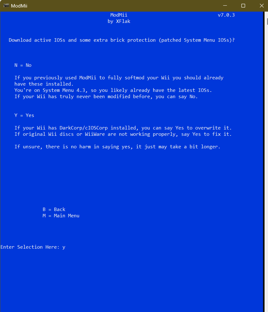 Na tela seguinte, digite “y” para atualizar todas as IOSs e cIOSs do console, adicionando proteção extra contra bricks. Se houver algum problema com jogos via discos, wiiware e etc, isso vai resolver também. Confirme com enter para prosseguir: