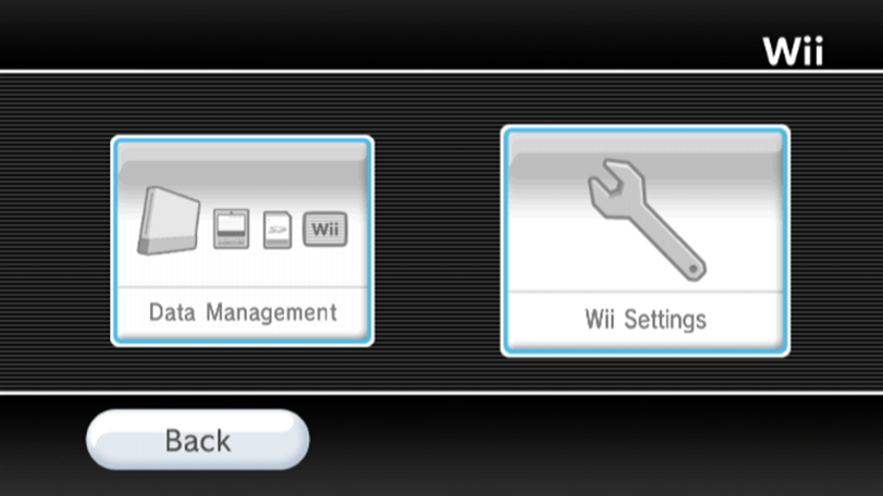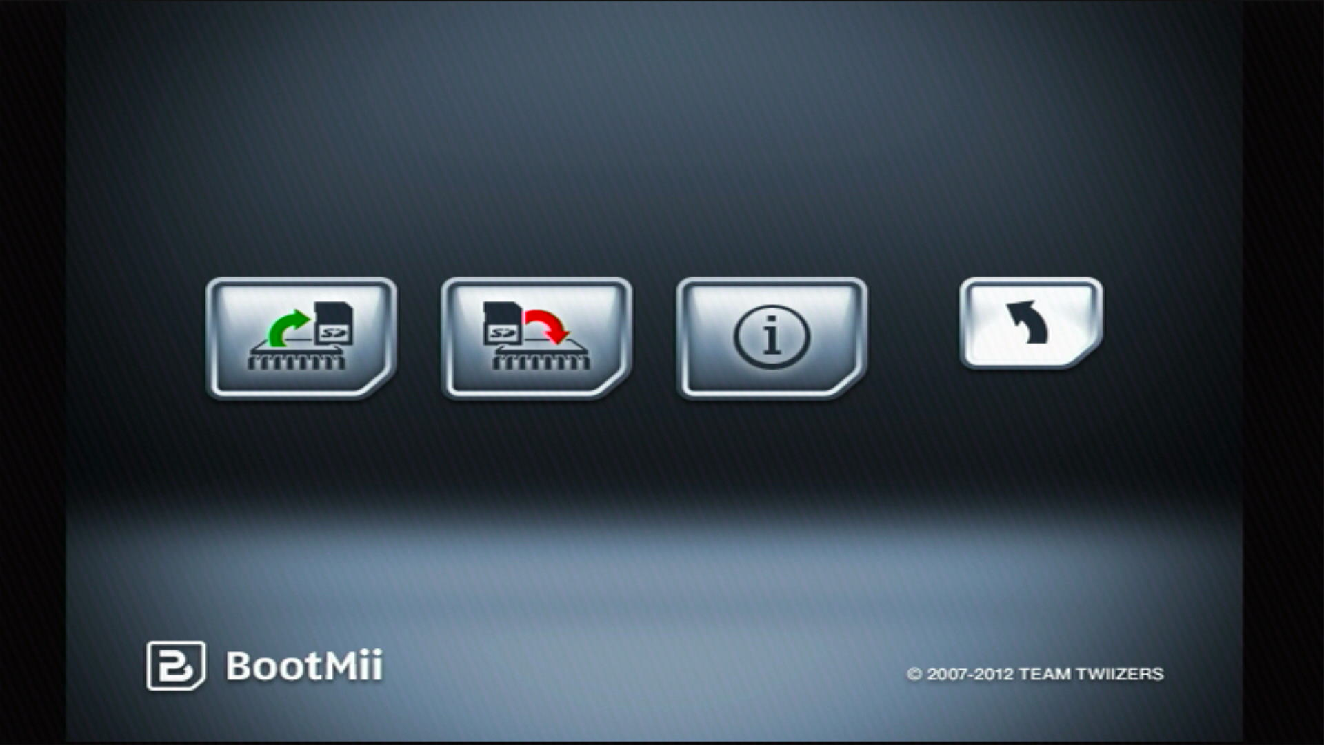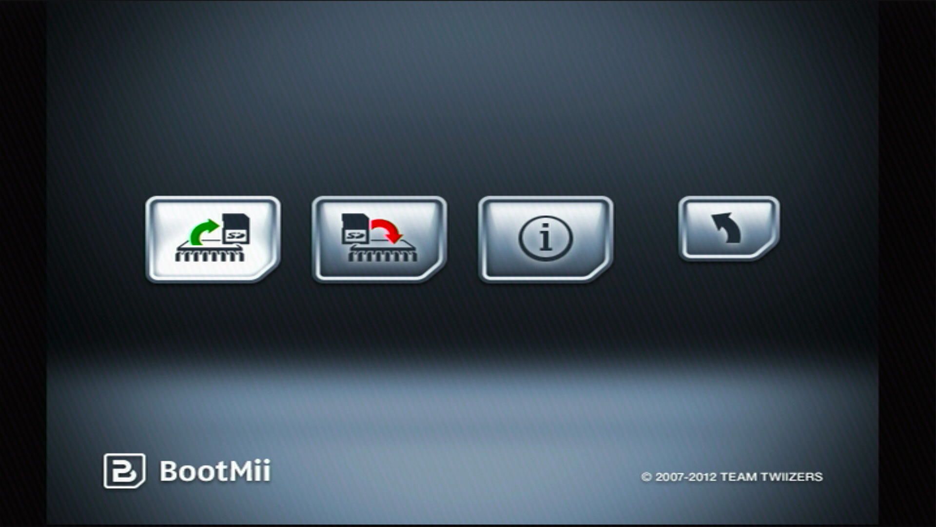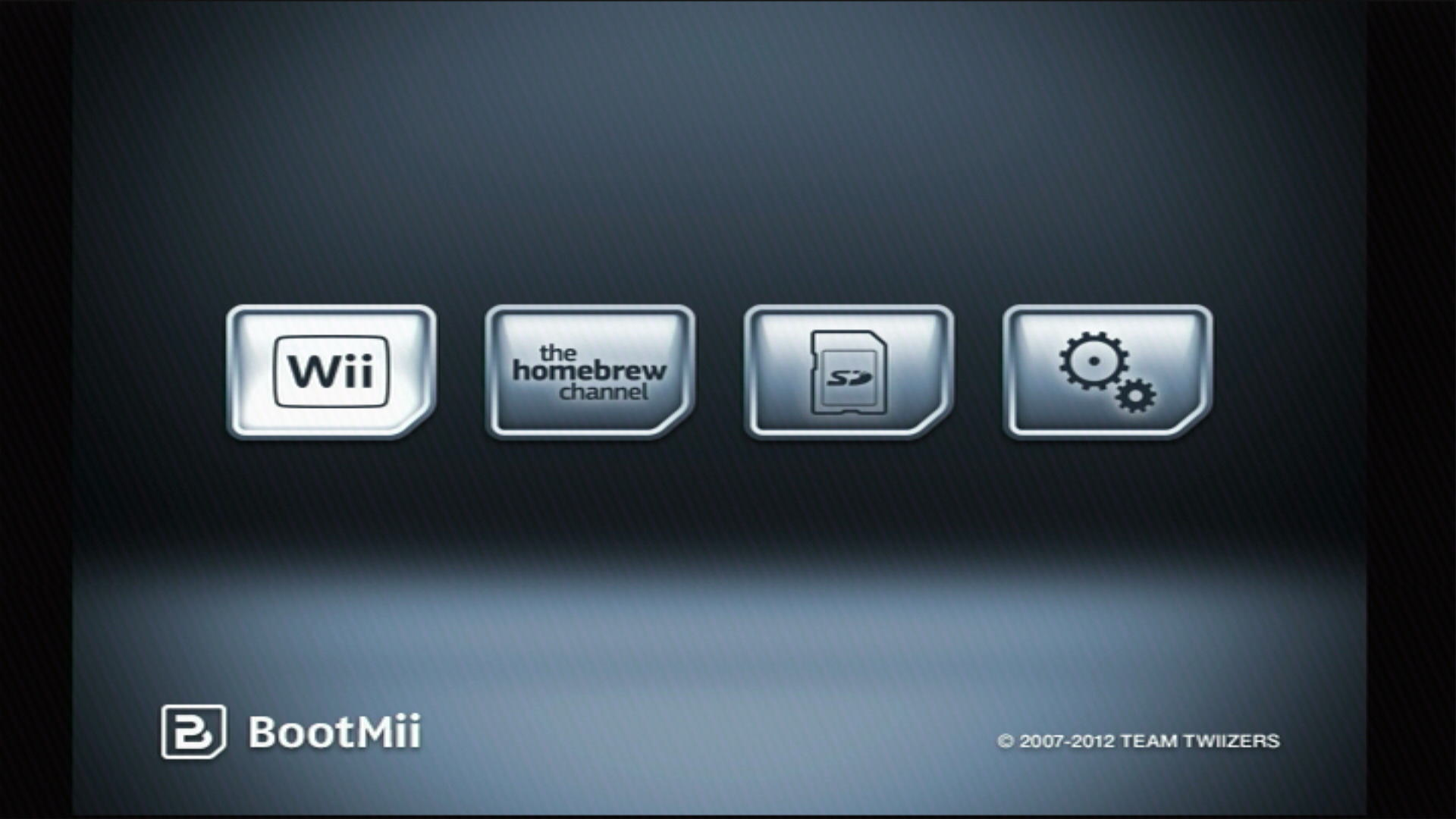 Você verá uma imagem com abaixo. No BootMii, você só pode navegar usando os botões físicos do console: “Power” e “Reset“. Aperte o botão power até chegar no ícone de configurações (o ultimo):