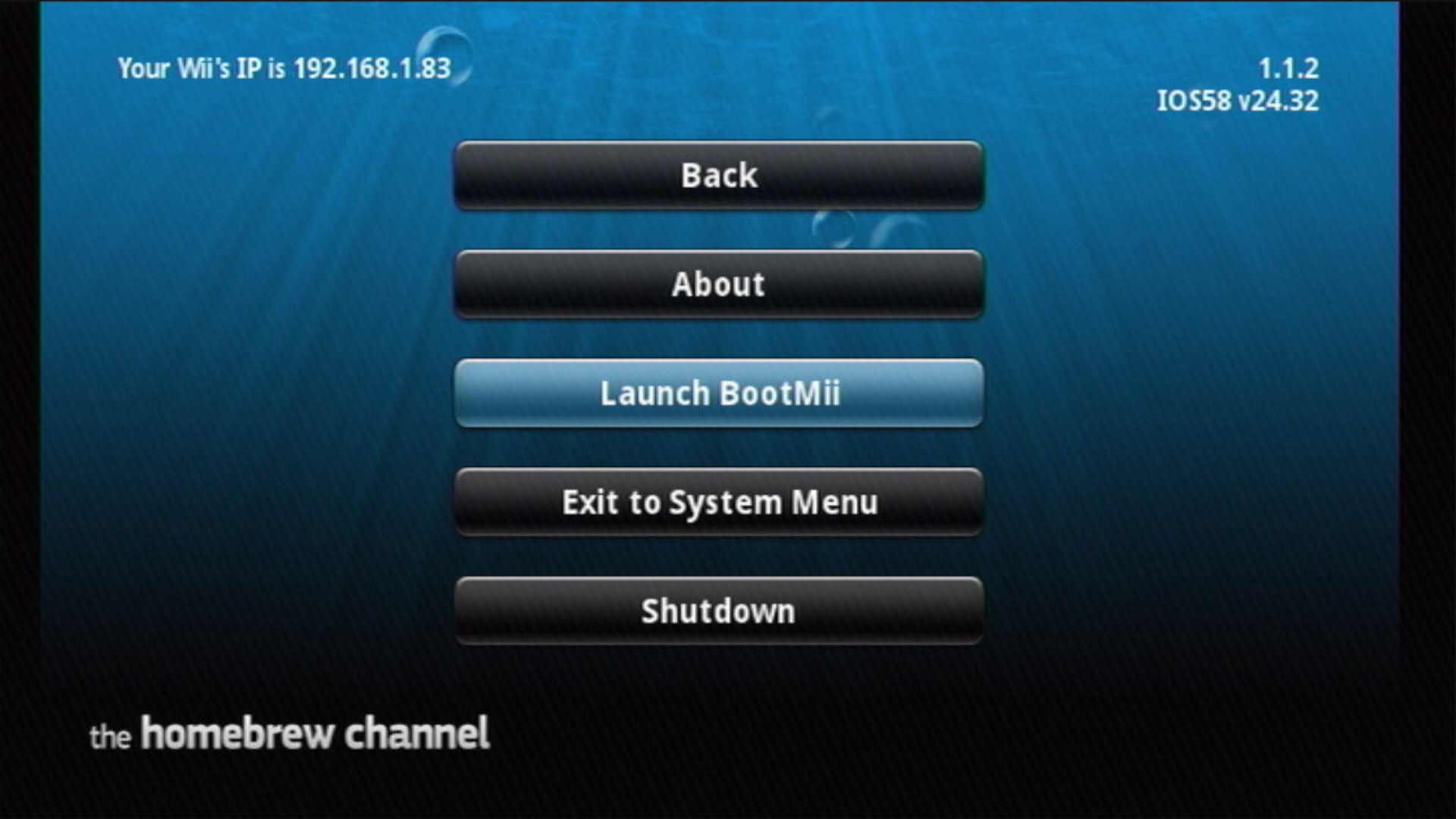 O backup da NAND é como um ponto de restauração do Wii. É pra caso você brickar o seu Wii, é raro mas acontece. Pra acessar o backup da nand, você vai precisar do BootMii. No The Homebrew Channel, com o Wii Remote, pressione o botão Home e clique em “Launch BootMii“: