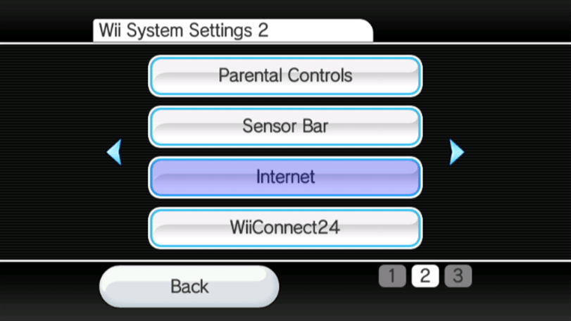3 – Vá para “pagina 2” apertando o botão “+” do Wii Remote e entre na opção “Internet“: