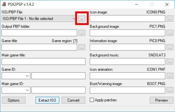 5 – Após clicar nos três pontinhos vai abrir o gerenciador de arquivos, busque pela imagem do jogo que você converterá em pbp, eu escolhi o jogo Bloody Roar 2 Ripado, note que depois que você seleciona o game, o título do jogo e as informações de ID serão preenchidos automaticamente.